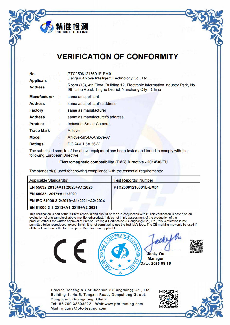我司八月份顺利取得A|系列智能相机CE,FCC产品认证